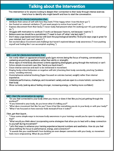 Interestingly, although designed specifically for IE, the constructs and practices are broadly applicable across exercise intensities. While cognitive reframing is particularly relevant for IE, constructs like interoception and safety hold universal relevance.
